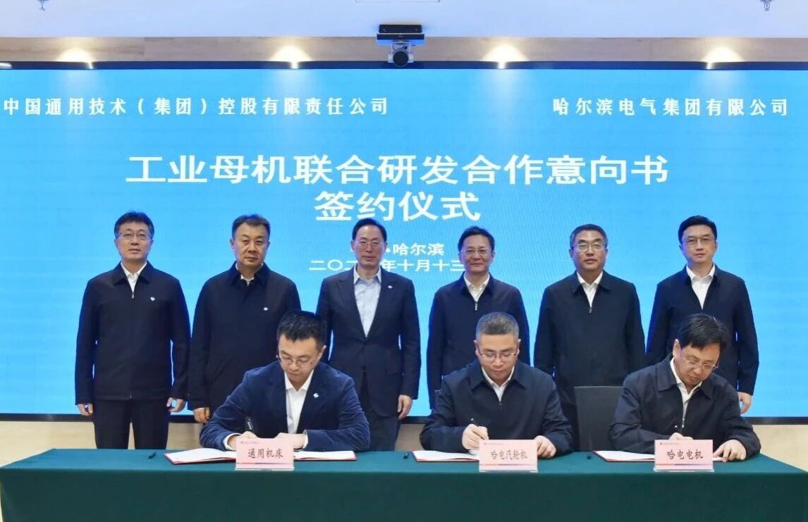 10月13日,哈電集團與通用技術集團在哈電集團總部簽署工業母機聯合研發合作意向書。哈電集團董事長、黨委書記黃偉,總經理、黨委副書記劉清勇,通用技術集團黨組書記、董事長于旭波,總經理、黨組副書記崔志成共同見證簽約并舉行座談交流。哈電集團黨委常委、副總經理陳輝,通用技術集團副總經理、黨組成員賈大風參加活動。