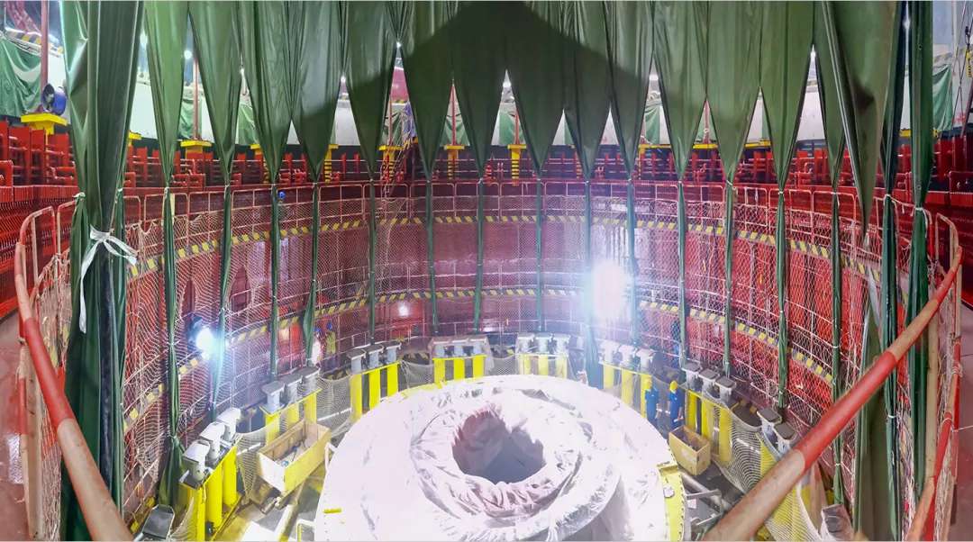 16時09分,在千噸橋機的緩緩牽引下,這顆世紀工程的“巨無霸”心臟,精準吊入機坑,開始調整安裝。