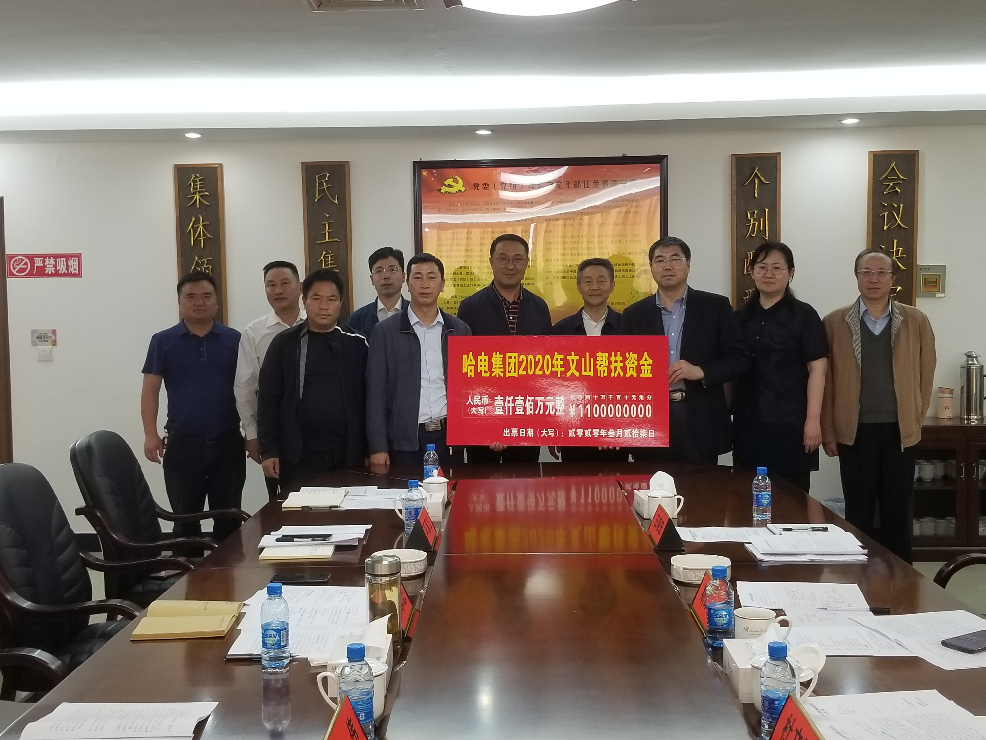 2020年3月,哈電集團(tuán)黨委書記、董事長斯?jié)煞蛞恍芯团朔咔橛绊憽Q戰(zhàn)決勝脫貧攻堅(jiān)進(jìn)行了深入交流,并舉行了哈電集團(tuán)2020年文山資金捐贈儀式。
