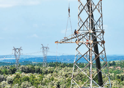 江西500千伏吉安南輸變電工程是江西省重點工程,投運后可加強(qiáng)該省吉安市南部電網(wǎng)與吉安主網(wǎng)聯(lián)絡(luò),提升新能源電力消納能力。圖為日前在該項目施工現(xiàn)場,電力工人正在高空進(jìn)行輸電鐵塔架設(shè)安裝作業(yè)。