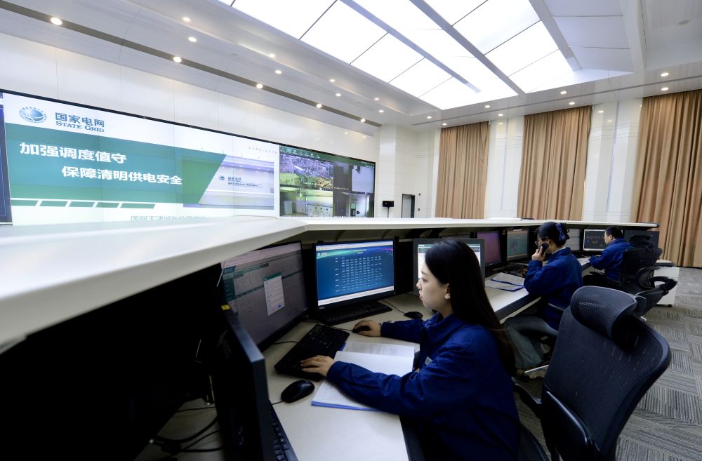 天津城東公司調度值班人員在監測區域電網運行狀態。新華社發
