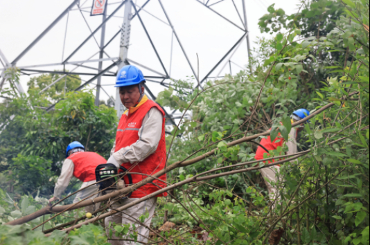 國網(wǎng)重慶電力員工在500千伏洪板一線237號塔附近修剪樹竹。