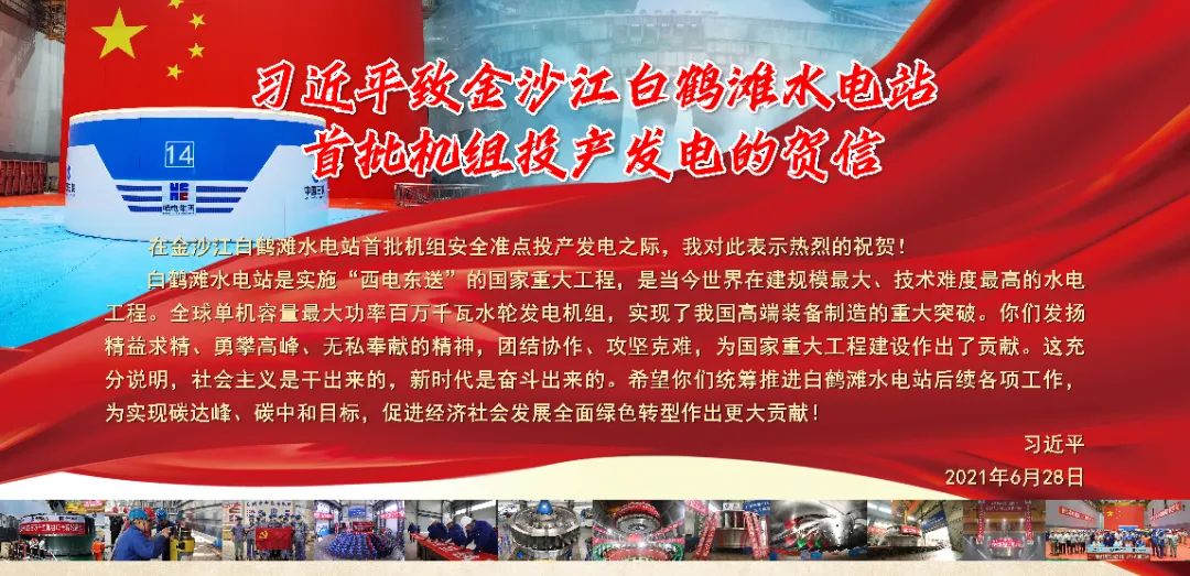 2021年6月28日,金沙江白鶴灘水電站首批機組投產發電,中共中央總書記、國家主席、中央軍委主席習近平致信祝賀,寄語廣大項目建設者——統籌推進白鶴灘水電站后續各項工作,為實現碳達峰、碳中和目標,促進經濟社會發展全面綠色轉型作出更大貢獻!