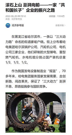 新華社多個(gè)平臺(tái)講述哈電故事:新華社客戶端、《新華每日電訊》刊發(fā)《我國(guó)發(fā)電設(shè)備制造業(yè)“搖籃”哈電集團(tuán)競(jìng)逐“綠色賽道”》《哈電集團(tuán)穩(wěn)步推進(jìn)高質(zhì)量發(fā)展》等多篇文章;新華社刊發(fā)《哈電集團(tuán)探索自主創(chuàng)新走出“換擋加速”新路》《“大國(guó)重器”企業(yè)轉(zhuǎn)型面臨多重挑戰(zhàn)》等文章。經(jīng)濟(jì)參考報(bào)專版刊發(fā)《滾石上山 澎湃向前——一家“共和國(guó)長(zhǎng)子”企業(yè)的振興之路》閱讀量近140萬(wàn)。