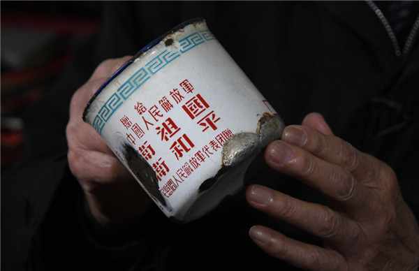 多年來,他只是小心翼翼地,把1954年“全國人民慰問人民解放軍代表團”頒發的一個搪瓷缸,擺在觸手可及的地方。這只補了又補、不能再用的缸子上,一面是天安門、和平鴿,一面寫著:贈給英勇的中國人民解放軍——保衛祖國、保衛和平。