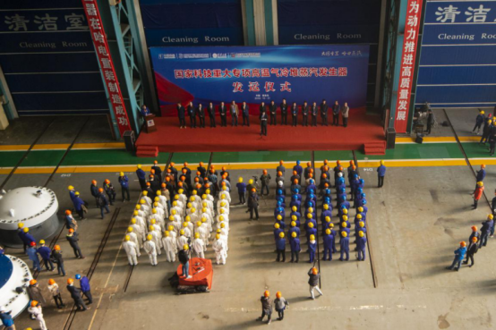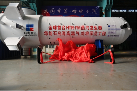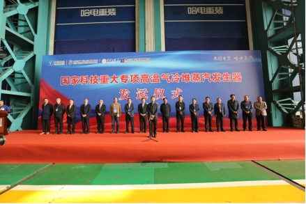 驗(yàn)收會后,哈電集團(tuán)黨委書記、董事長斯?jié)煞蚺c中國華能黨組成員、副總經(jīng)理葉向東共同為“大國重器”揭幕,各方代表分別致辭,對國家科技重大專項(xiàng)全球首臺高溫氣冷堆蒸汽發(fā)生器研制成功并順利通過驗(yàn)收表示祝賀。